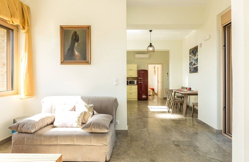 Climbing some stairs from the attic, you will reach the first floors apartment, which can be accessed both from indoors and outdoors, through a stair on the parking area. This studio can be totally independent and autonomous, as it consists of an additional sitting area with a sofa, a 40" HDTV and a second kitchen with a dining area. Furthermore, two more bedrooms, one with two single beds and the other one with a double bed are also available on this level. Finally, both bedrooms have en-suite bathrooms with a shower cabin. This apartment also offers access to the first floor veranda, equipped with patio furniture and also boasting magnificent views. From the first floor veranda, you can also reach the Villas roof top, which offers the best view of the area and has sun beds, where you can sunbathe and enjoy the sun and peacefulness.