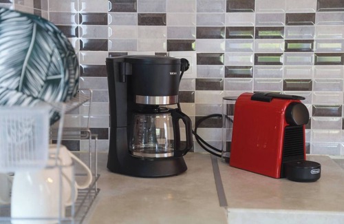 Inside, the house features everything you need for a worry-free stay. The open-plan living and dining area is bright and welcoming, with cozy seating, a flat-screen TV, and air conditioning for warm summer days. The kitchen is fully stocked with modern appliances, including an oven, refrigerator, coffee machine, toaster, and all the cookware you’ll need to prepare delicious meals at home. The bathroom is clean and functional, with a washing machine available for longer stays.