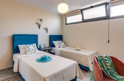 - Twin room with en-suite shower room and patio doors opening onto the pool terrace.